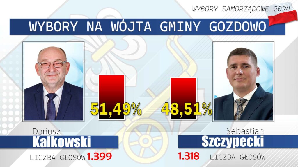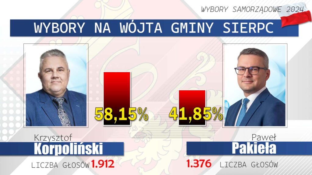 Zmiana wójta w Mochowie. W wyniku niedzielnych wyborów dotychczasowego włodarza gminy Zbigniewa Tomaszewskiego zastąpił Zbigniew Kopczyński reprezentujący prawo i sprawiedliwość. Nowy wójt uzyskał 1342 głosy, a ustępujący ze stanowiska 1204. Nie doszło natomiast do zmiany na najwyższym urzędzie w gminie Gozdowo. Po bardzo zaciętym boju lepszy o zaledwie 71 od pretendującego do urzędu Sebastiana Szczypeckiego okazał się Dariusz Kalkowski. Na fotelu wójta w gminie Sierpc pozostaje także Krzysztof Korpoliński, który zwyciężył w rywalizacji z Pawłem Pakiełą. Z kolei w gminie Rościszewo dotychczasowy włodarz uzyskał poparcie na poziomie ponad 80%. Tutaj jednak Jan Sugajski nie miał żadnego konkurenta, a wyborcy głosowali jedynie „za” lub „przeciw”. Jak się okazało zdecydowana większość mieszkańców gminy zaakceptowała jego dotychczasowe poczynania. Nieco inaczej wygląda sytuacja w dwóch pozostałych gminach naszego powiatu. Tam do wyłonienia wójta potrzebne będą II tury. I tak w Szczutowie spośród trójki kandydatów na placu boju został dotychczasowy wójt Andrzej Twardowski i pretendentka Aneta Emilia Ruszkowska, która nieznacznie, bo zaledwie 14-toma głosami zwyciężyła w I turze. W Zawidzu natomiast na placu boju pozostali Dariusz Franczak dotychczas sprawujący urząd wójta oraz Kamil Rózański ubiegający się o mandat. Tutaj jednak do rozstrzygnięcia w I turze panu Kamilowi zabrakło zaledwie niespełna 1,5 % głosów. O tym, kto zostanie wójtem zadycydują w II turze mieszkańcy gminy.